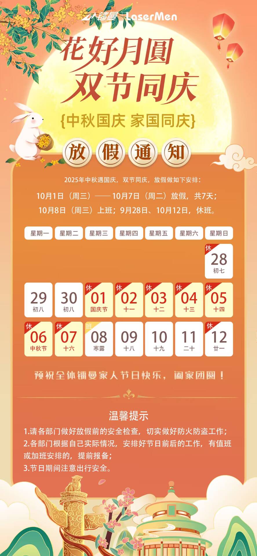 愿我們?cè)?“家國同慶” 的美好氛圍中,心懷感恩、勇?lián)姑?,以奮斗之姿共赴新征程,以實(shí)干之力書寫新篇章。鐳曼激光衷心祝愿偉大的祖國山河錦繡、繁榮昌盛!祝愿全體員工、合作伙伴及社會(huì)各界朋友雙節(jié)安康、闔家幸福、萬事順意!